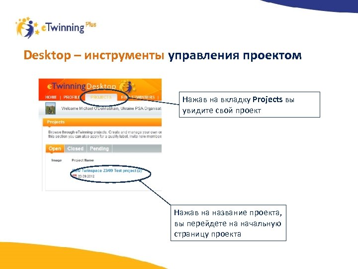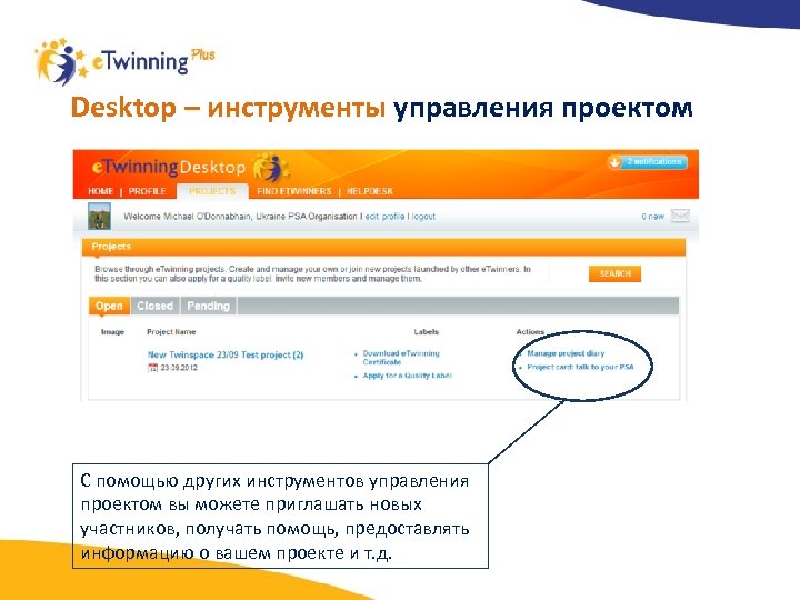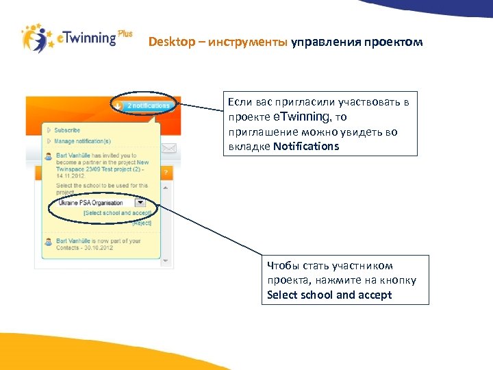 Desktop – инструменты управления проектом Если вас пригласили участвовать в проекте e. Twinning, то приглашение можно увидеть во вкладке Notifications Чтобы стать участником проекта, нажмите на кнопку Select school and accept