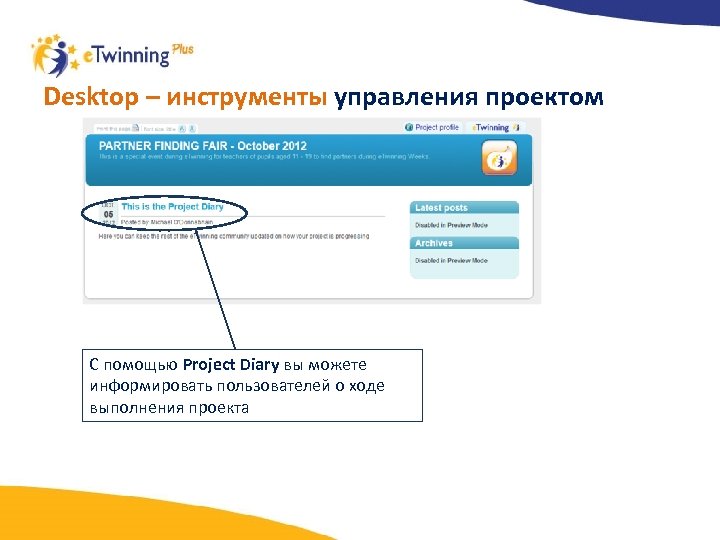 Desktop – инструменты управления проектом С помощью Project Diary вы можете информировать пользователей о ходе выполнения проекта
