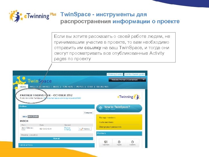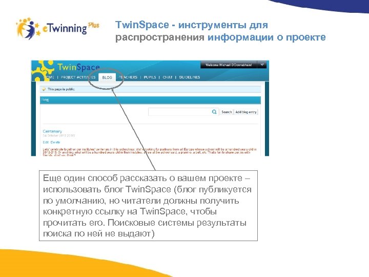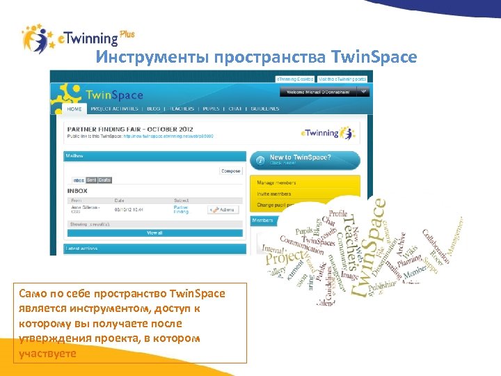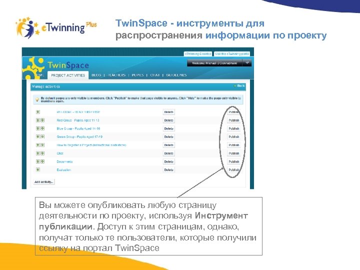 Twin. Space - инструменты для распространения информации по проекту Вы можете опубликовать любую страницу деятельности по проекту, используя Инструмент публикации. Доступ к этим страницам, однако, получат только те пользователи, которые получили ссылку на портал Twin. Space