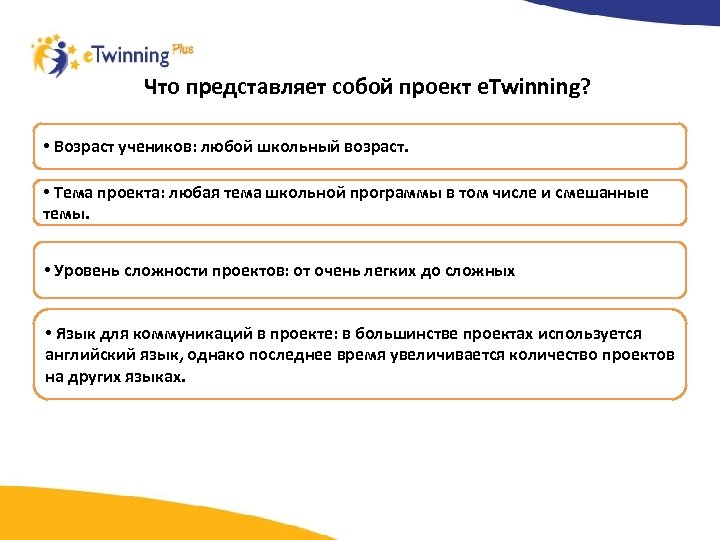 Что представляет собой проект e. Twinning? • Возраст учеников: любой школьный возраст. • Тема проекта: любая тема школьной программы в том числе и смешанные темы. • Уровень сложности проектов: от очень легких до сложных • Язык для коммуникаций в проекте: в большинстве проектах используется английский язык, однако последнее время увеличивается количество проектов на других языках.