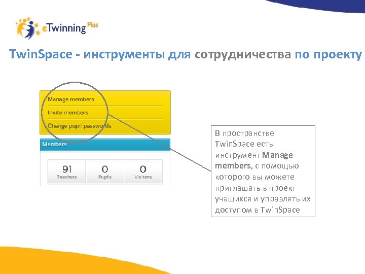 Twin. Space - инструменты для сотрудничества по проекту В пространстве Twin. Space есть инструмент Manage members, с помощью которого вы можете приглашать в проект учащихся и управлять их доступом в Twin. Space