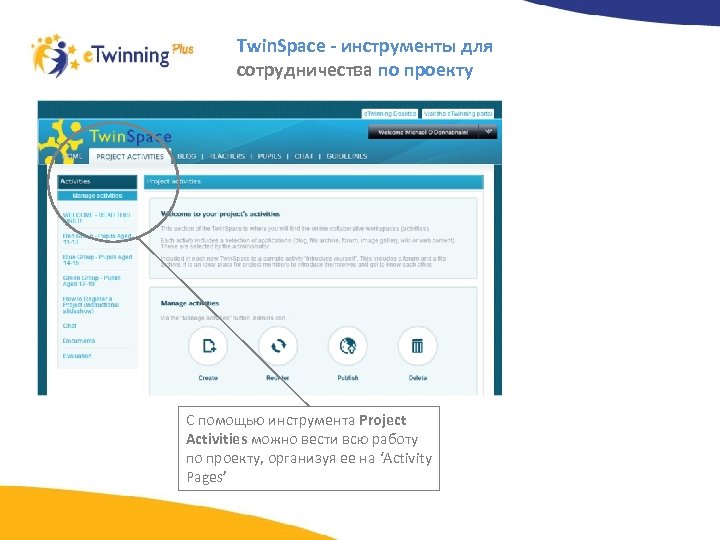 Twin. Space - инструменты для сотрудничества по проекту С помощью инструмента Project Activities можно вести всю работу по проекту, организуя ее на ‘Activity Pages’