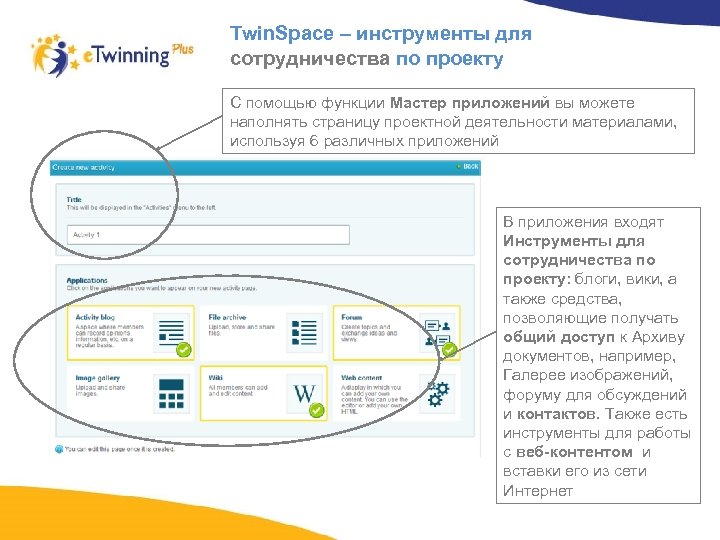 Twin. Space – инструменты для сотрудничества по проекту С помощью функции Мастер приложений вы можете наполнять страницу проектной деятельности материалами, используя 6 различных приложений В приложения входят Инструменты для сотрудничества по проекту: блоги, вики, а также средства, позволяющие получать общий доступ к Архиву документов, например, Галерее изображений, форуму для обсуждений и контактов. Также есть инструменты для работы с веб-контентом и вставки его из сети Интернет