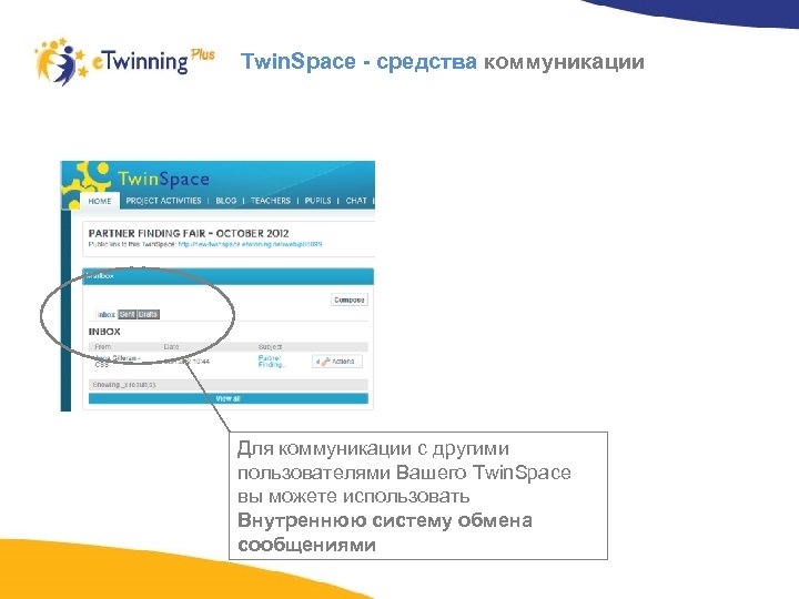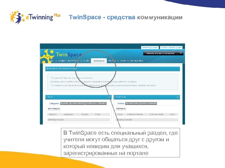 Twin. Space - средства коммуникации В Twin. Space есть специальный раздел, где учителя могут общаться друг с другом и который невидим для учащихся, зарегистрированных на портале