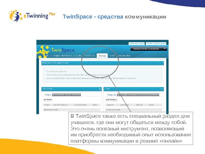 Twin. Space - средства коммуникации В Twin. Space также есть специальный раздел для учащихся, где они могут общаться между собой. Это очень полезный инструмент, позволяющий им приобрести необходимый опыт использования платформы коммуникации в режиме «онлайн»