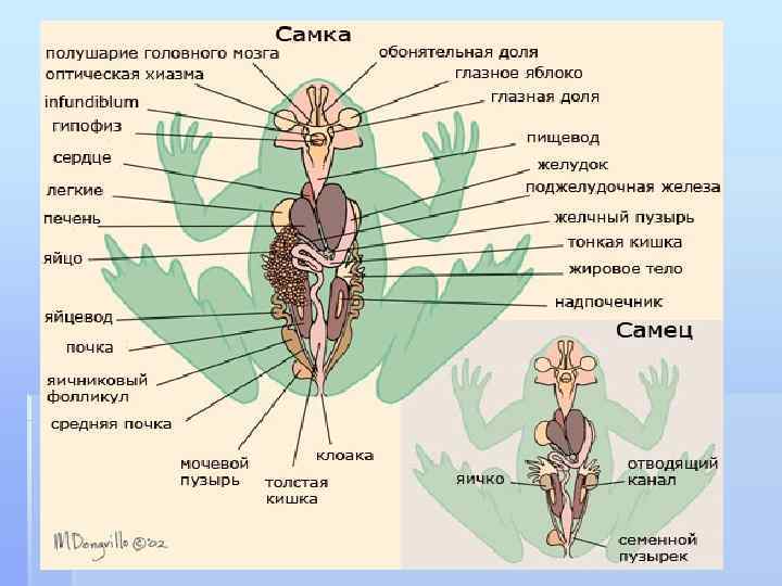 § Кожа лягушек прикреплена к самому телу только в нескольких местах. У бесхвостых земноводных под кожей имеются обширные лимфатические лакуны - своеобразные резервуары, позволяющие при благоприятных условиях накапливать запас воды. Полосками соединительной ткани, образующими перемычки между лакунами, кожа соединяется с мускулатурой тела лишь в немногих участках. § Четыре раза в год лягушки линяют и съедают свою кожу. Лягушка может впитывать влагу через поверхность кожи, и жидкость сразу же включается в состав тканей. Лягушачья кожа гораздо легче пропускает воду внутрь, чем наружу. Здесь немалую роль играет слизь, обильно смачивающая всю поверхность тела. Если слизь удалена, лягушка теряет воду прямо на глазах, сохнет в пять раз быстрее. Слизь сохраняет воду, помогает выскальзывать из лап и клюва врага, не дает селиться микробам на влажной коже. Поэтому лягушек и пускают в молоко, чтобы оно не скисло, молочнокислые бактерии уже не могут там активно размножаться. Из слизи даже делают антибиотики.