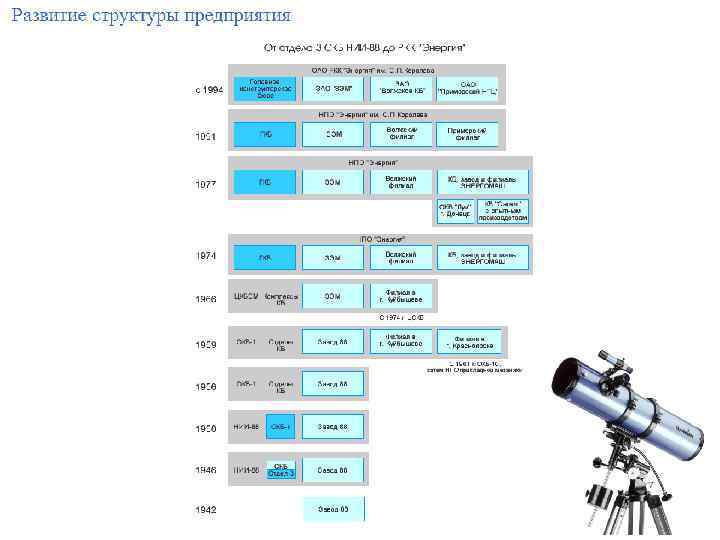 При головной роли предприятия созданы и эксплуатировались: • отечественные пилотируемые космические корабли "Восток" (1960 -1963), на одном из которых совершил полет Ю. А. Гагарин, "Восход" (1964 -1968), "Союз" (1966 -1981), Союз Т" (1979 -1986), "Союз ТМ" (1986 -2002), • отечественные грузовые космические корабли "Прогресс" (1978 -1989), "Прогресс М" (с 1989), • орбитальные станции "Салют" (1971), "Салют-4" (1974 -1977), "Салют-6" (1977 -1982), "Салют-7" (1982 -1991) и многомодульная станция "Мир" (1986 -2001), • космическая орбитальная обсерватория "Гамма" астрофизического и геофизического направлений (1990 -1992), • космические аппараты "Зенит" для детальной фотосъемки земной поверхности (1962), • первые отечественные спутники связи "Молния-1" (1965), • многоразовая космическая система "Буран" с крупнейшей в мире ракетой-носителем "Энергия" (1987), которая до настоящего времени не имеет технических аналогов в мире, и многоразовым орбитальным кораблем "Буран" (1988), а также разработаны другие проекты, направленные на развитие перспективных средств ракетно-космической техники (пилотируемые лунные комплексы Л 1, Л 3, ракета-носитель сверхтяжелого класса Н 1, многоцелевой орбитальный комплекс, марсианский пилотируемый комплекс и др. ). Предприятие являлось активным участником международных космических программ: "Союз-Аполлон", "Интеркосмос". В 1991 -2005 гг. заложены, реализованы и реализуются российские программы создания и эксплуатации первого Международного исследовательского космического центра "Мир", на котором выполнялись проекты "Евромир", "Мир-Шаттл", "Мир-НАСА", развернуты работы по Международной космической станции, многоразовой транспортной космической системе, впервые в мире в рамках транснациональной компании осуществлена разработка и обеспечивается эксплуатация комплекса "Морской старт", ведутся работы по европейскому грузовому кораблю ATV, "Наземный старт", созданы на базе универсальной платформы современные спутники связи, дистанционного зондирования "Бел. КА", ведутся работы по космическим комплексам специального назначения и т. д. В различные периоды работы организации ее возглавляли академики С. П. Королев (1946 -1966), В. П. Мишин (1966 -1974), В. П. Глушко (1974 -1989), Ю. П. Семенов (1989 -2005). В настоящее время деятельностью Корпорации руководит член-корреспондент РАН В. А. Лопота. Награды Предприятие награждено 4 орденами Ленина, орденом Октябрьской революции, имеет Благодарность Президента Российской Федерации. Структура: Головное конструкторское бюро; Филиал "Байконур"; ЗАО "Завод экспериментального машиностроения РКК "Энергия"; ЗАО "Волжское КБ"; ЗАО "ПО "Космос" РКК "Энергия"; Развитая социальная инфраструктура. В собственности государства 38% акций Корпорации.