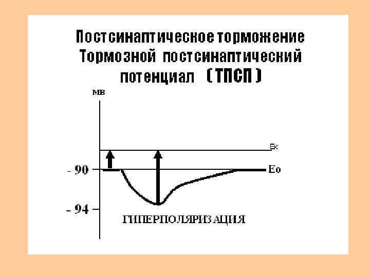 Постсинаптическое торможение • В тормозных синапсах выделяются тормозные медиаторы (глицин, гамма аминомасляная кислота). • Тормозной синапс может иметь тот же медиатор, что и возбуждающий, но иную природу рецепторов постсинаптической мембраны. • Тормозной эффект может быть достигнут при активации калиевых каналов (К+ выходит наружу) и хлорных каналов (Сl входит внутрь клетки). • Происходит гиперполяризация постсинаптической мембраны, возникает ТПСП – тормозной постсинаптический потенциал.