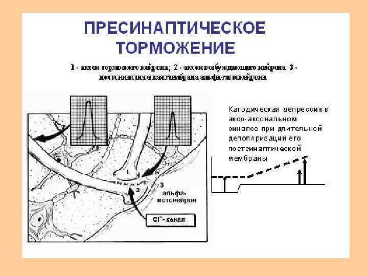 • Пресинаптическое торможение. • Оно открыто в ЦНС сравнительно недавно, поэтому изучено меньше. • Пресинаптическое торможение локализуется в пресинаптических терминалях перед синаптической бляшкой. • На пресинаптических терминалях располагаются окончания аксонов других нервных клеток, образующих здесь аксональные синапсы. • Медиаторы их деполяризуют мембрану терминалей и приводят в состояние, подобное катодической депрессии Вериго. • Это обусловливает частичную или полную блокаду проведения по нервным волокнам возбуждающих импульсов, идущих к нервным окончаниям. Пресинаптическое торможение обычно длительное.