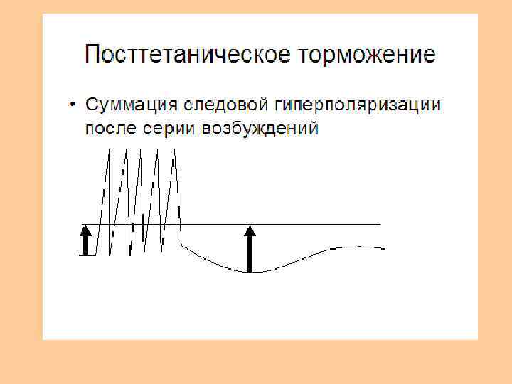 • Посттетаническое торможение. • Особый вид торможения, которое возникает в случае, если после окончания возбуждения в клетке возникает сильная гиперполяризация мембраны. • Возбуждающий постсинаптический потенциал в этих условиях оказывается недостаточным для критической деполяризации мембраны и генерации распространяющегося возбуждения. • Причина такого торможения в том, что следовые потенциалы способны к суммации, и после серии частых импульсов возникает суммация положительного следового потенциала.