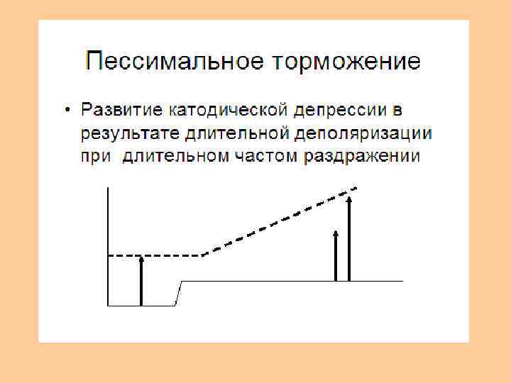 • Пессимальное торможение. • Торможение деятельности нервной клетки может осуществляться и без участия особых тормозных структур. • В этом случае оно возникает в возбуждающих синапсах в результате сильной деполяризации постсинаптической мембраны под влиянием слишком частых импульсов (как пессимум в нервно мышечном препарате). • К пессимальному торможению особо склонны промежуточные нейроны спинного мозга, нейроны ретикулярной формации. • При стойкой деполяризации в них наступает состояние, подобное катодической депрессии Вериго.