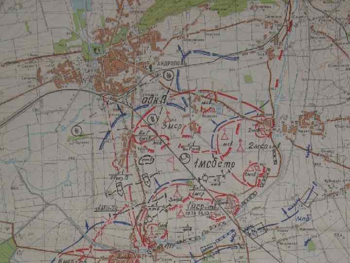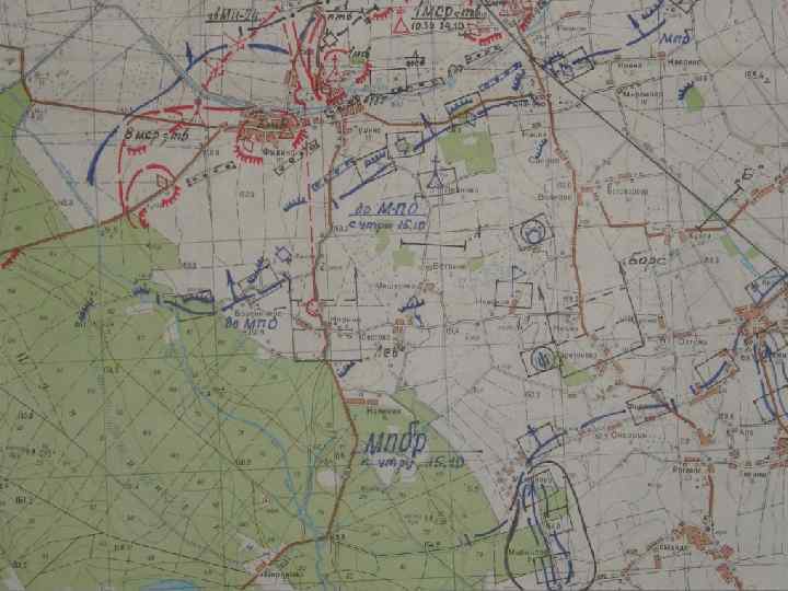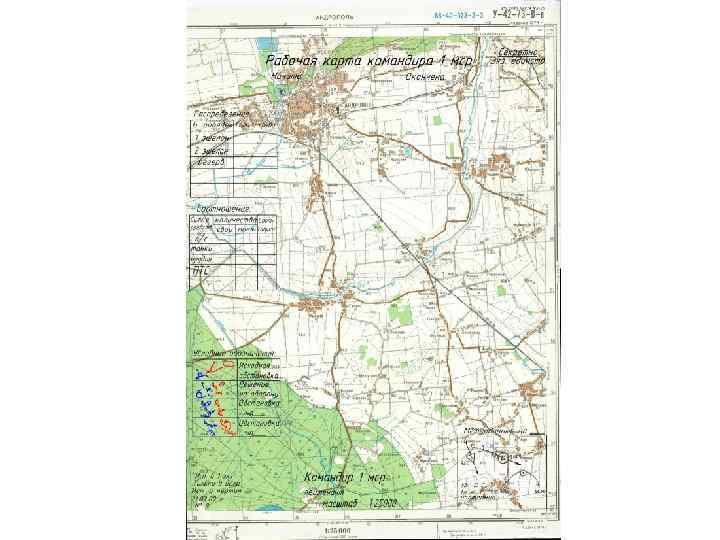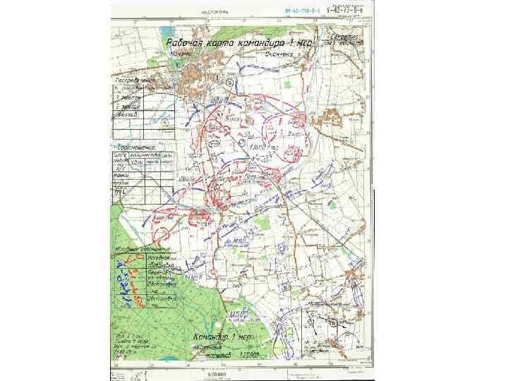 На рабочую карту командира мотострелкового подразделения обычно наносится: • состав, положение своих подразделений с подробностью на две ступени ниже, например, в батальоне - до взвода (отдельного орудия, миномета); • состав, положение и возможный характер действий противника на глубину поставленной задачи на направлении действий подразделения и примыкающих к нему флангах; • данные о радиационной, химической и бактериологической (биологической) обстановке; • боевая задача подразделения, поставленная старшим командиром (начальником); • положение и задачи непосредственных соседей (справа и слева), а также действующих впереди подразделений, их пункты управления; • разграничительные линии между батальонами; • задачи огневых средств, находящихся в распоряжении командира подразделения, и их позиции; • места установки инженерных заграждений; • маршруты движения; • наблюдательные, командно-наблюдательные и командные пункты старшего командира (начальника) и соседей; • районы расположения тыловых подразделений.