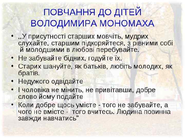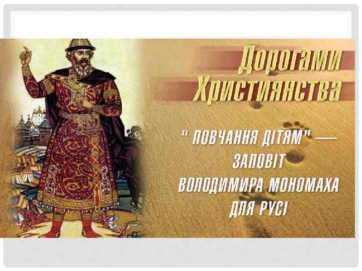, , ПОВЧАННЯ ДІТЯМ, , ВОЛОДИМИРА МОНОМАХА • «Повчання» — оригінальний твір, у якому Володимир Мономах висловлює думки загальнодержавного, політичного та морального характеру, повчає своїх дітей бути розумними правителями, захищати інтереси Русі, боротися з князівськими міжусобицями, самим учитися й поширювати освіту