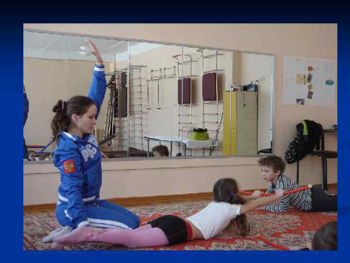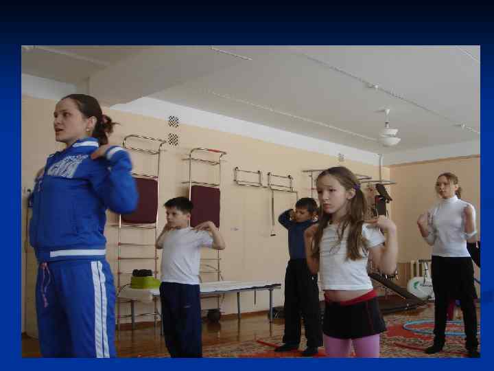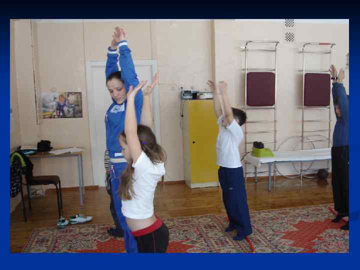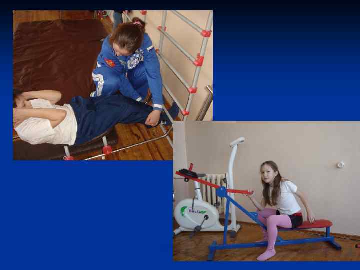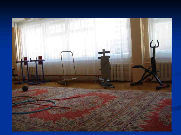 Лечебная физическая культура – составная часть медицинской реабилитации больных, метод комплексной функциональной терапии, использующей физические упражнения как средства сохранения организма больного в деятельном состоянии, стимуляции его внутренних резервов, предупреждения и лечения болезней, вызванных вынужденной гиподинамией. Спортивные сооружения: тренажеры, шведская стенка, кушетка, зеркала, гимнастические палки, мячи, обручи, скамейки, вибромассажер «Золотая рыбка» .