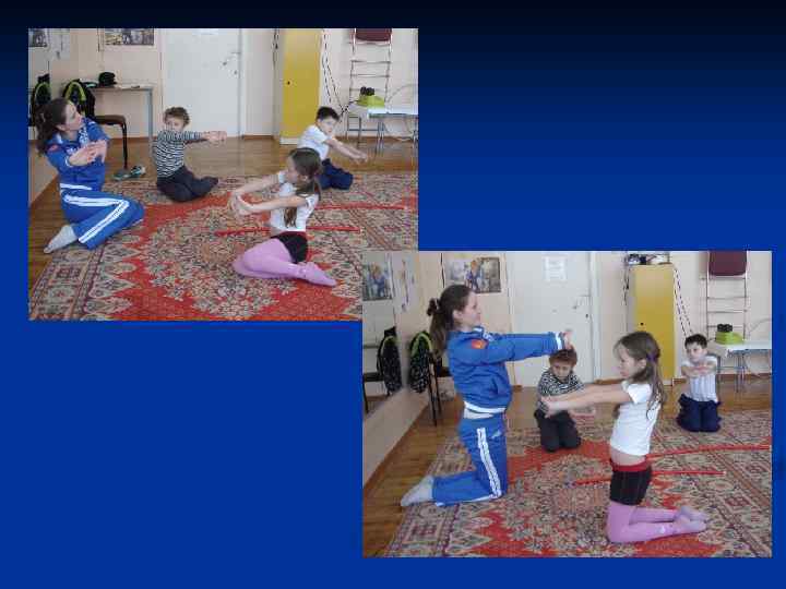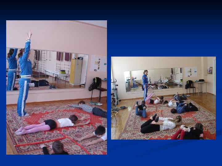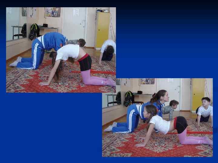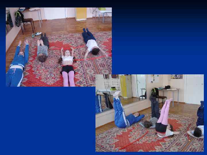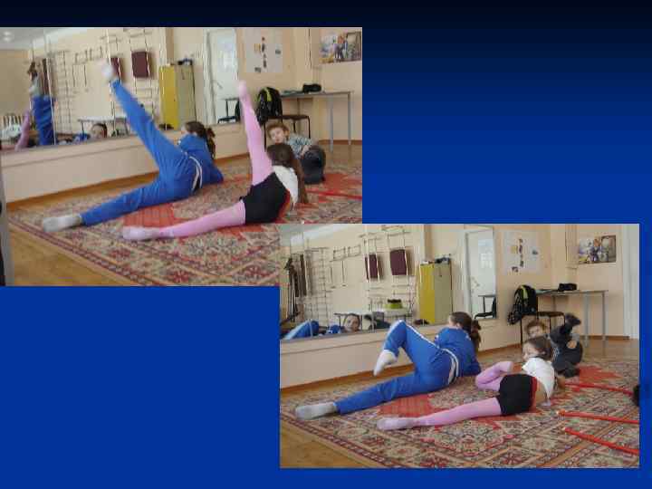 Дыхательные упражнения. И. п. стоя , наступаем на гимнастическую палку, руки на поясе. Делаем перенос ног с носочков на пятки. На носочки-вдох на пятки – выдох. И. п. лежа на полу. «Велосипед» И. п. лежа на спине. Сгибать и разгибать ноги в коленном и тазобедренном суставах поочередно. И. п. лежа на спине. «Ножницы» И. п. лежа на спине. Руки за голову. Поочередно поднимаем прямые ноги вперед И. п. лежа на боку. Прямую ногу вверх, опустить вниз согнуть в коленном суставе, вперед, в сторону.