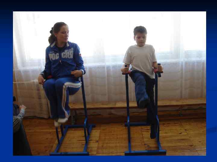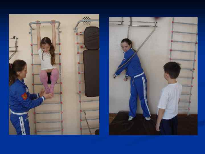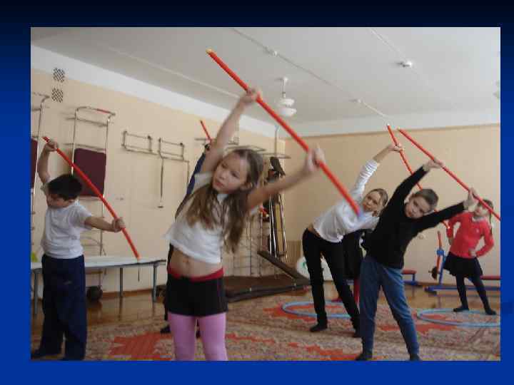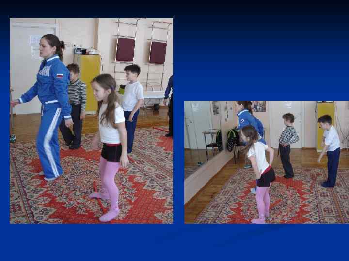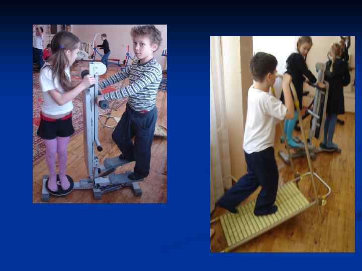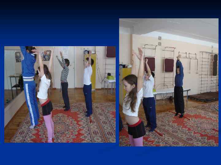 Ходьба на носках с высоким подниманием колений Ходьба скользящими шагами со сгибанием пальцев. Ходьба по ребристой доске. Ходьба по двусторонней наклонной плоскости. Ходьба по скошенной поверхности, пяткой к вершине. Ходьба с приведением переднего отдела стопы, поднимаясь на носки на каждом шагу. Ходьба по наклонной плоскости на носках. Дыхательные упражнения. И. п. стоя на гимнастической палке, ноги на ширине плеч, руки вдоль туловища. Руки вверх – вдох, встаем на носочки, руки вниз – выдох. И. п. стоя. Наклоны головы вправо, влево, вперед, назад. И. п. стоя, ноги на ширине плеч, руки вверх с гимнастической палкой. Наклоны туловища: вправо-2 раза, влево-2 раза. И. п. стоя, руки на поясе. круговые движения таза