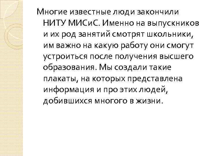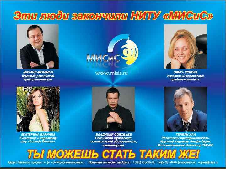 Многие известные люди закончили НИТУ МИСи. С. Именно на выпускников и их род занятий смотрят школьники, им важно на какую работу они смогут устроиться после получения высшего образования. Мы создали такие плакаты, на которых представлена информация и про этих людей, добившихся многого в жизни.