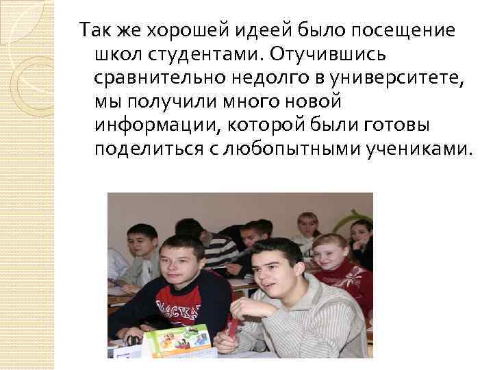 Так же хорошей идеей было посещение школ студентами. Отучившись сравнительно недолго в университете, мы получили много новой информации, которой были готовы поделиться с любопытными учениками.