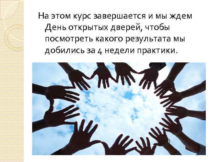 На этом курс завершается и мы ждем День открытых дверей, чтобы посмотреть какого результата мы добились за 4 недели практики.