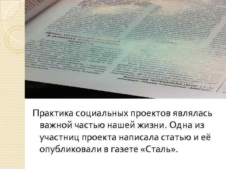 Практика социальных проектов являлась важной частью нашей жизни. Одна из участниц проекта написала статью и её опубликовали в газете «Сталь» .