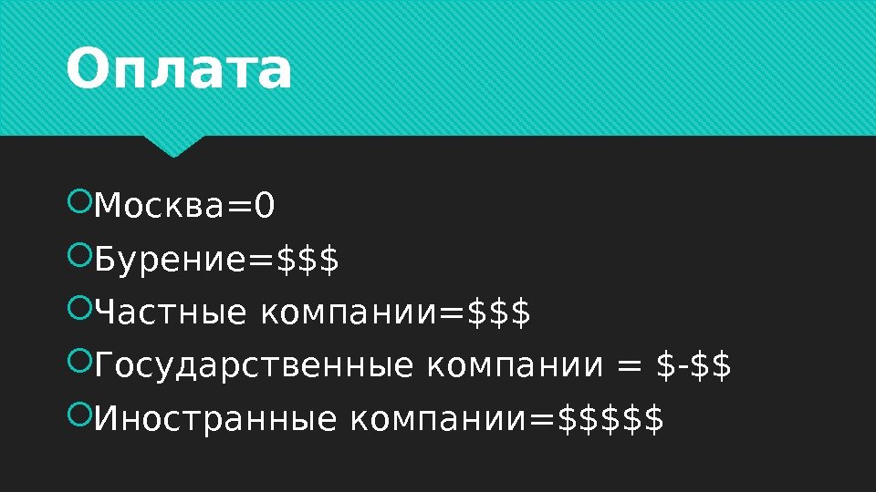 Оплата Москва=0 Бурение=$$$ Частные компании=$$$ Государственные компании = $-$$ Иностранные компании=$$$$$
