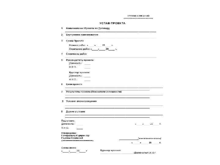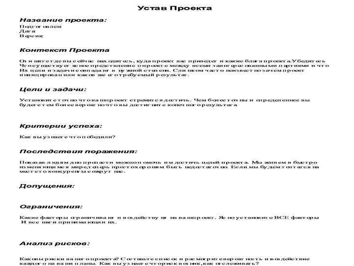 Устав Проекта Уставом проекта является документ, который формально авторизует проект. Ему следует включить в себя либо прямо, либо со ссылкой на другие документы бизнес - потребность , для которой проект осуществляется, цели проекта, описание продукта проекта, планируемый способ исполнения проекта. Устав (обоснование) проекта должно быть выпущен (утвержден) менеджером, который находится на более высокой ступени иерархической лестницы компании, чем менеджер данного проекта и на том уровне, чтобы соответствовать нуждам данного проекта.