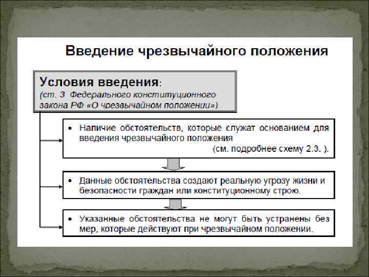 ВП ЧП КТО Нормативно-правовое основание Ст. 56, 87, 102, 109 К; ФКЗ О ВП Ст. 56, 88, 102, 109 К; ФКЗ О ЧП ФЗ О противодействии терроризму цель отражение или предотвращение агрессии против РФ устранение обстоятельств, послуживших основанием для его введения, обеспечение защиты прав и свобод человека и гражданина, защита конституционного строя РФ. пресечение и раскрытие террористического акта, минимизация его последствий и защита жизненно важных интересов личности, общества и государства Обстоятельства для введения агрессия против РФ или непосредственная угроза такой агрессии непосредственная угроза жизни и безопасности граждан или конституционного строя. Основания подразделяются на две категории: попытки насильственного изменения конституционного строя, вооружённый мятеж, региональные конфликты и т. п. чрезвычайные ситуации природного и техногенного характера, стихийные бедствия и т. п. (ст. 3). для пресечения террористического акта, если его пресечение иными силами или способами невозможно