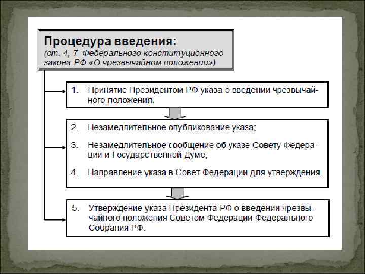ВП ЧП КТО Территория введения на территории РФ в целом, в отдельных ее местностях Четко не опрнделено Порядок введения 1. Принятие Президентом РФ указа о введении чрезвычайного положения. 2. Незамедлительное опубликование указа; 3. Незамедлительное сообщение об указе СФ и ГД; 4. Направление указа в СФ для утверждения Принятие Президентом РФ указа о введении военного положения. 2. Незамедлительное сообщение об указе и ГД; 3. Направление указа в СФ для утверждения. 4. Утверждение указа Президента РФ СФ в течение 48 часов с момента получения указа. Решение о проведении контртеррористической операции может принимать директор ФСБ либо руководители территориальных органов ФСБ. Срок окончания после устранения обстоятельств, послуживших основанием для его введения 30 суток (если введено на территории всей РФ) и 60 суток (если в отдельных регионах России) террористический акт пресечен (прекращен) и ликвидирована угроза жизни, здоровью, имуществу и иным охраняемым законом интересам людей, находящихся на территории, в пределах которой проводилась контртеррористическая операция