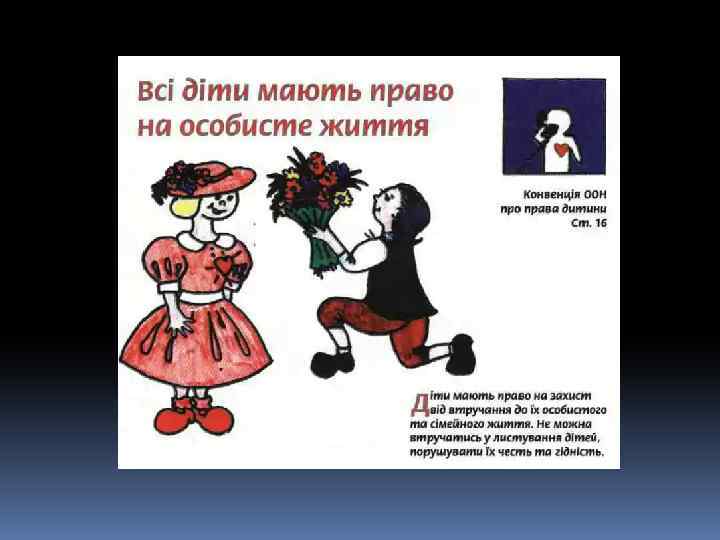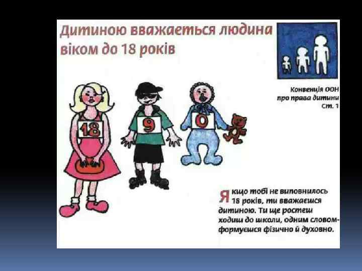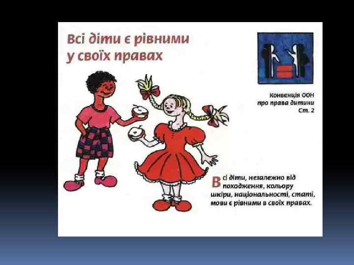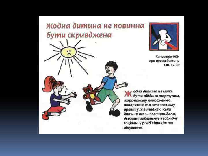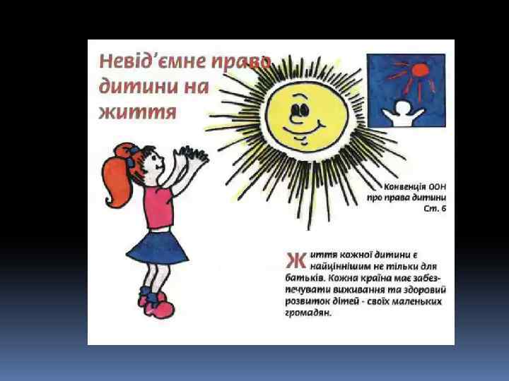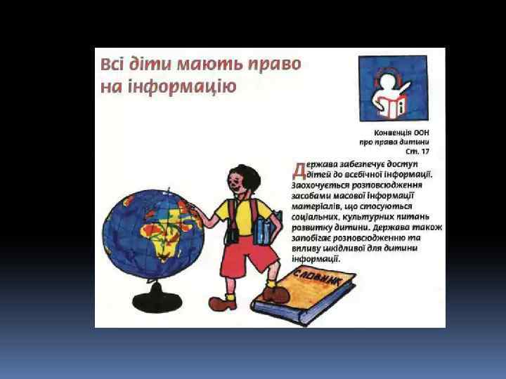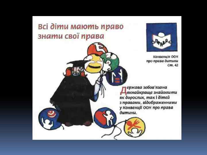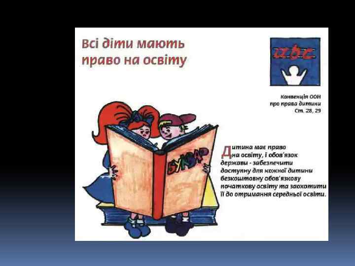 Декларація – це просто Оголошення всіх прав. Є права й дітей, звичайно, Треба, щоб усяк їх знав. 1924 рік – перша Декларація прав дитини. 1959 – Декларація прав дитини. 1982 – Конвенція ООН про права дитини. q 1991 - Україна підписала Конвенцію ООН про права дитини та зобов’язалась її виконувати: ü 1991 – прийнято Закон України про освіту. ü 1996 – прийнято Конституцію України ü 2001 – прийнято Закон України «Про охорону дитинства» .