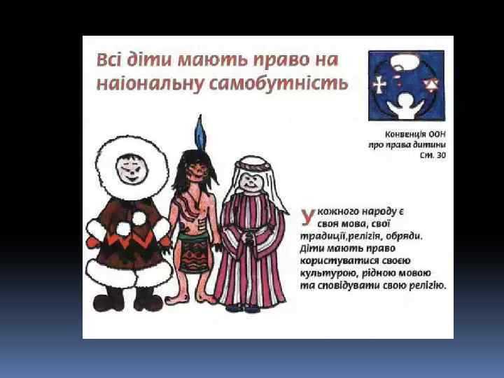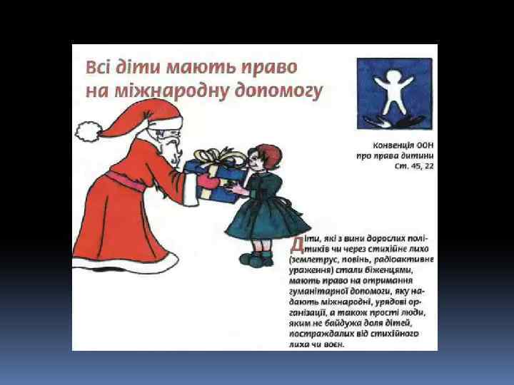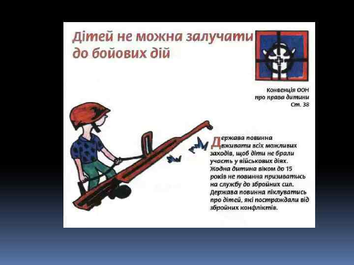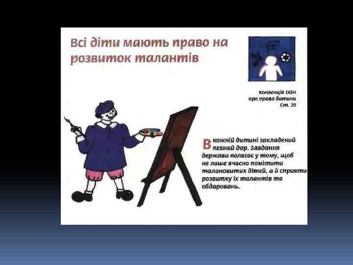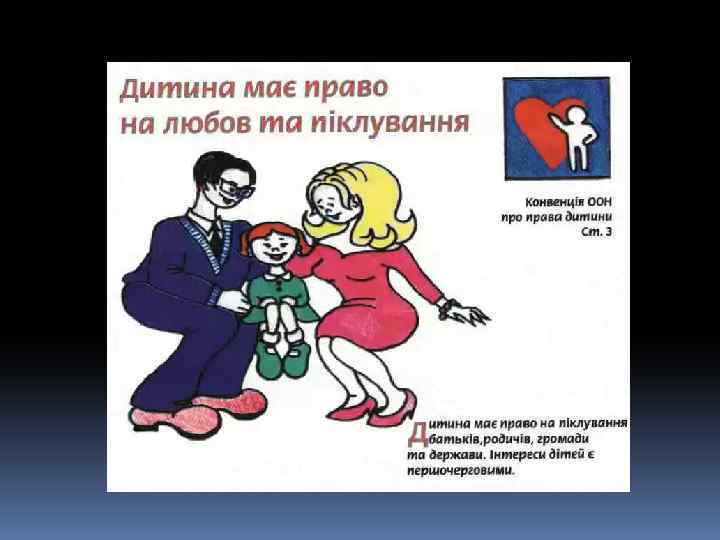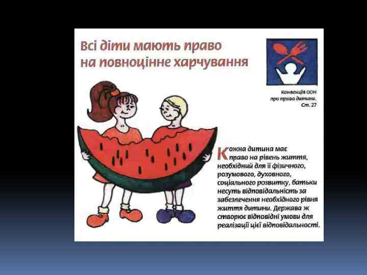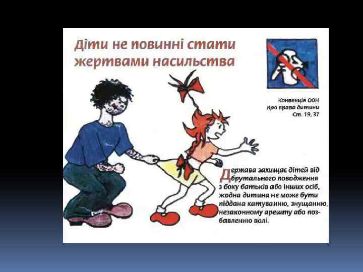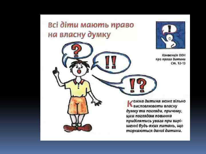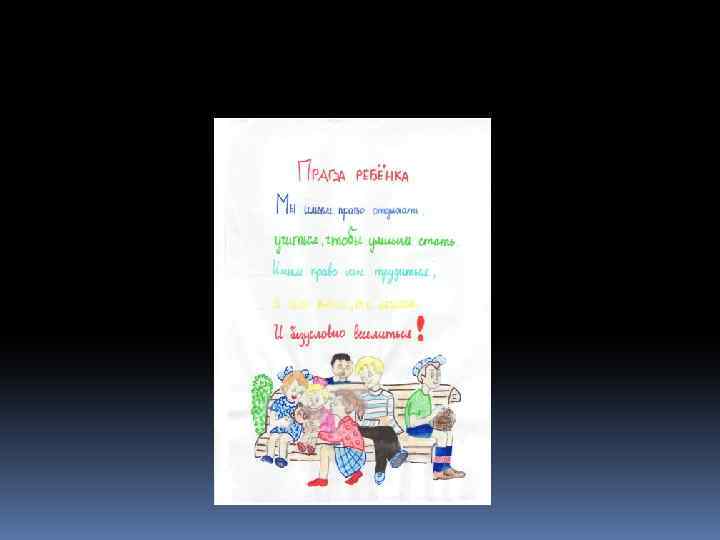 Декларація – це просто Оголошення всіх прав. Є права й дітей, звичайно, Треба, щоб усяк їх знав. 1924 рік – перша Декларація прав дитини. 1959 – Декларація прав дитини. 1982 – Конвенція ООН про права дитини. q 1991 - Україна підписала Конвенцію ООН про права дитини та зобов’язалась її виконувати: ü 1991 – прийнято Закон України про освіту. ü 1996 – прийнято Конституцію України ü 2001 – прийнято Закон України «Про охорону дитинства» .