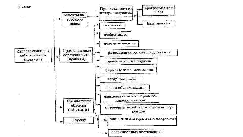 Интеллектуальная собственность 1) произведения науки, литературы и искусства; 2) программы для электронных вычислительных машин (программы для ЭВМ); 3) базы данных; 4) исполнения; 5) фонограммы; 6) сообщение в эфир или по кабелю радио- или телепередач (вещание организаций эфирного или кабельного вещания); 7) изобретения; 8) полезные модели; 9) промышленные образцы; 10) селекционные достижения; 11) топологии интегральных микросхем; 12) секреты производства (ноу-хау); 13) фирменные наименования; 14) товарные знаки и знаки обслуживания; 15) наименования мест происхождения товаров; 16) коммерческие обозначения.