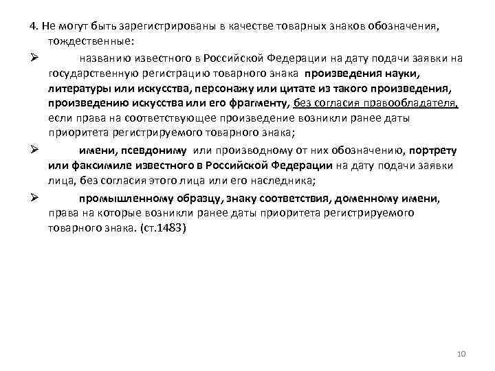 4. Не могут быть зарегистрированы в качестве товарных знаков обозначения, тождественные: Ø названию известного в Российской Федерации на дату подачи заявки на государственную регистрацию товарного знака произведения науки, литературы или искусства, персонажу или цитате из такого произведения, произведению искусства или его фрагменту, без согласия правообладателя, если права на соответствующее произведение возникли ранее даты приоритета регистрируемого товарного знака; Ø имени, псевдониму или производному от них обозначению, портрету или факсимиле известного в Российской Федерации на дату подачи заявки лица, без согласия этого лица или его наследника; Ø промышленному образцу, знаку соответствия, доменному имени, права на которые возникли ранее даты приоритета регистрируемого товарного знака. (ст. 1483) 10