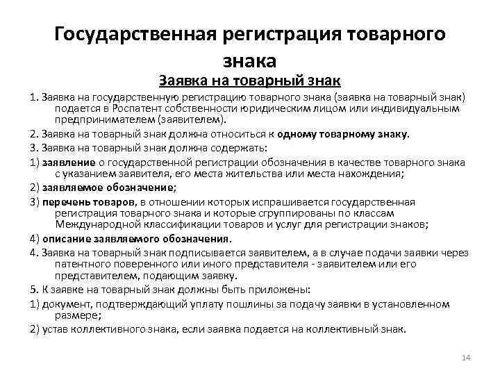 Государственная регистрация товарного знака Заявка на товарный знак 1. Заявка на государственную регистрацию товарного знака (заявка на товарный знак) подается в Роспатент собственности юридическим лицом или индивидуальным предпринимателем (заявителем). 2. Заявка на товарный знак должна относиться к одному товарному знаку. 3. Заявка на товарный знак должна содержать: 1) заявление о государственной регистрации обозначения в качестве товарного знака с указанием заявителя, его места жительства или места нахождения; 2) заявляемое обозначение; 3) перечень товаров, в отношении которых испрашивается государственная регистрация товарного знака и которые сгруппированы по классам Международной классификации товаров и услуг для регистрации знаков; 4) описание заявляемого обозначения. 4. Заявка на товарный знак подписывается заявителем, а в случае подачи заявки через патентного поверенного или иного представителя - заявителем или его представителем, подающим заявку. 5. К заявке на товарный знак должны быть приложены: 1) документ, подтверждающий уплату пошлины за подачу заявки в установленном размере; 2) устав коллективного знака, если заявка подается на коллективный знак. 14