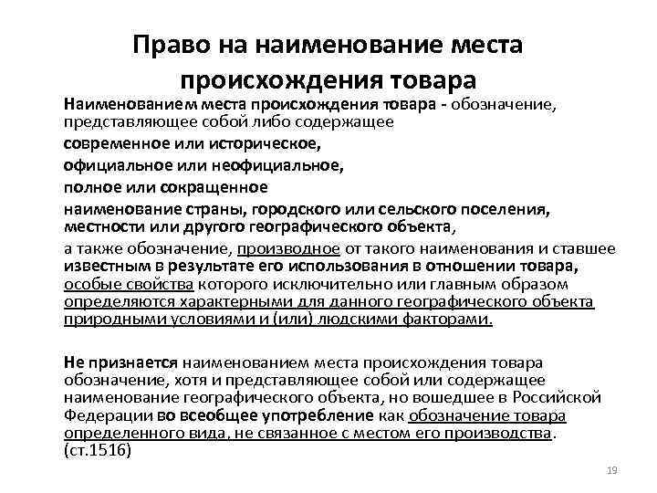 Право на наименование места происхождения товара Наименованием места происхождения товара - обозначение, представляющее собой либо содержащее современное или историческое, официальное или неофициальное, полное или сокращенное наименование страны, городского или сельского поселения, местности или другого географического объекта, а также обозначение, производное от такого наименования и ставшее известным в результате его использования в отношении товара, особые свойства которого исключительно или главным образом определяются характерными для данного географического объекта природными условиями и (или) людскими факторами. Не признается наименованием места происхождения товара обозначение, хотя и представляющее собой или содержащее наименование географического объекта, но вошедшее в Российской Федерации во всеобщее употребление как обозначение товара определенного вида, не связанное с местом его производства. (ст. 1516) 19