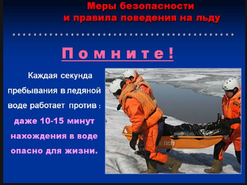 Категорически запрещается: Испытывать прочность льда ударом ноги по льду - в этом случае можно сразу провалиться в воду. Не разрешается переходить водоем в одиночку, т.к. в случае провала под лед, помощи ждать не от кого. Также нежелательно ходить по льду в темное время суток. Категорически запрещается катание на коньках, на санках, игра в хоккей на тонком неокрепшем льду. Подготовка льда для катания на коньках должна быть проведена очень тщательно. Толщина льда должна быть не менее 12 см, а при массовом катании - не менее 25 см. Не рекомендуется кататься на замерзшем льду одному.