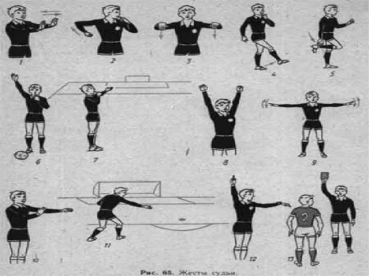 Сигнали і жести суддів Ø Ø Ø Здійснюючи суддівство гри, арбітр дає сигнали за допомогою свистка: На початку гри і відновлення після перерви і після забитого м'яча у ворота; При виконанні 11 -метрового удару, при взятті воріт, після закінчення гри або її половини; Звідси випливає, що при ударах від воріт, штрафному, вільному, кутовому ударах, якщо гравцями дотримані правила їх виконання, сигнал свистком не подається, а використовується жест рукою. Вкидання м'яча з-за бокової лінії використовується також без сигналу. В ході гри судді також доводиться використовувати жести. Вони повинні бути чіткими.