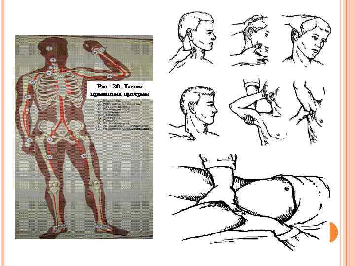 • • • Прижатие поврежденного сосуда на протяжении –сдавливание артерии выше её ранения и вены – ниже места её ранения. Для каждого крупного артериального ствола имеются типичные места, где производят его пальцевое прижатие. На конечностях сосуды прижимают выше раны, на шее и голове - ниже. Прижатие сосудов производят несколькими пальцами, но более эффективно двумя первыми пальцами обеих рук.