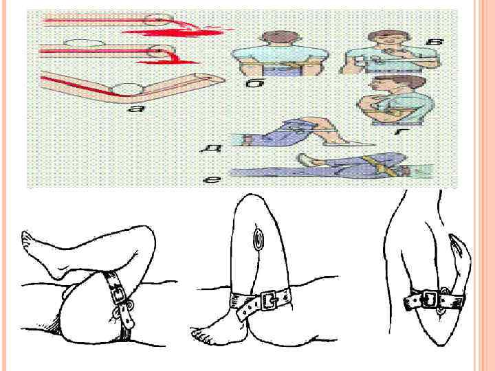 • • • При артериальном кровотечении- наложить жгут выше раны. При венозном - наложить тампоны и давящие повязки ниже раны. При капилярном- обеззаразить и перебинтовать рану.