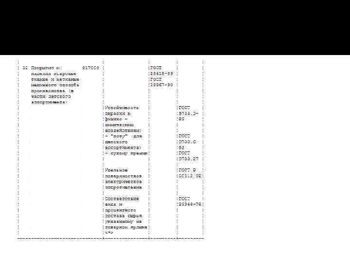 ПЕРЕЧЕНЬ ПОКАЗАТЕЛЕЙ, ИСПОЛЬЗУЕМЫХ ПРИ ОБЯЗАТЕЛЬНОЙ СЕРТИФИКАЦИИ ПРОДУКЦИИ ТЕКСТИЛЬНОЙ ПРОМЫШЛЕННОСТИ