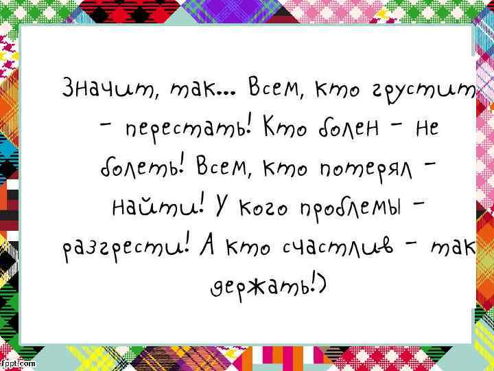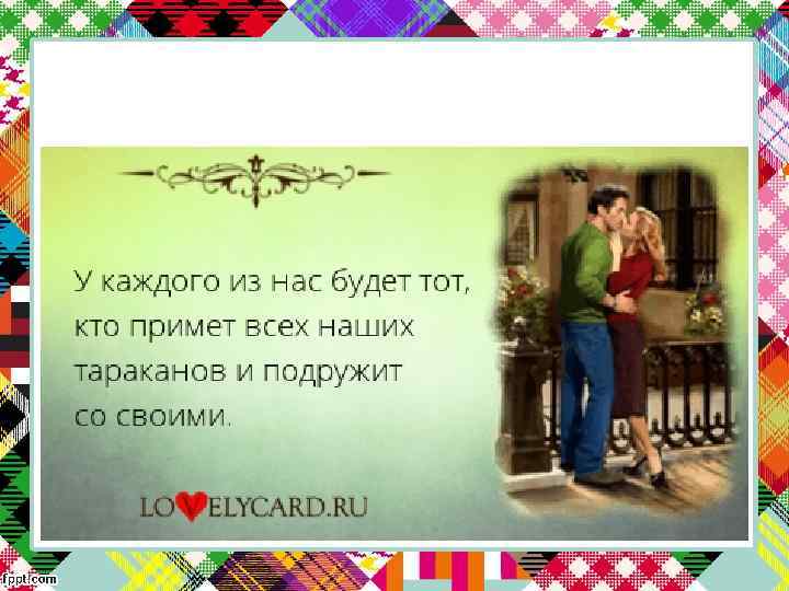 Мудрые советы: • Не встречайся с человеком только ради денег. Деньгами пресытишься. • Не встречайся с человеком только из за жалости. Жалость превратиться в гнев. • Не встречайся с человеком только ради того, чтобы завести детей. Дети вырастут и уедут, а с кем останешься ты?