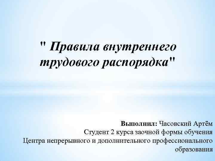 " Правила внутреннего трудового распорядка" Выполнил: Часовский Артём Студент 2 курса заочной формы обучения Центра непрерывного и дополнительного профессионального образования