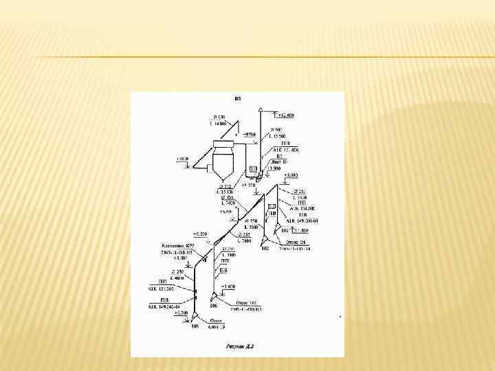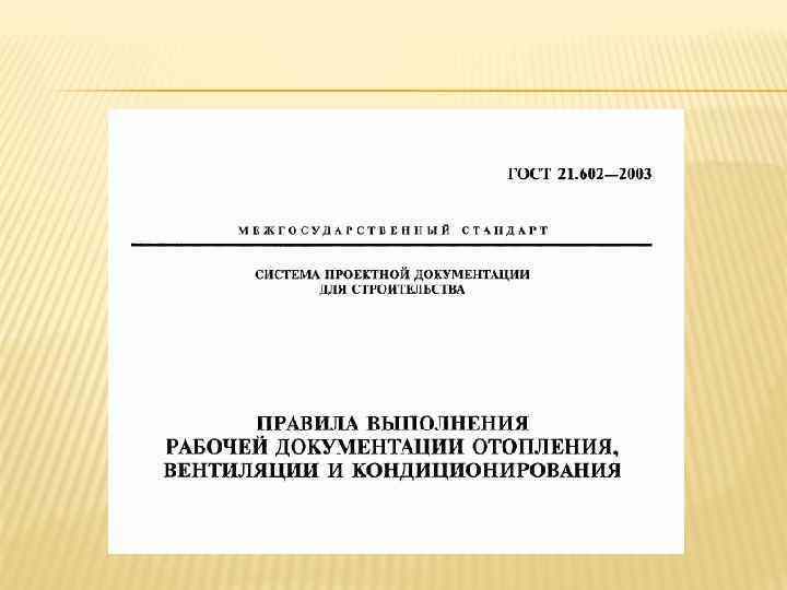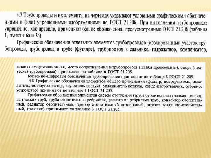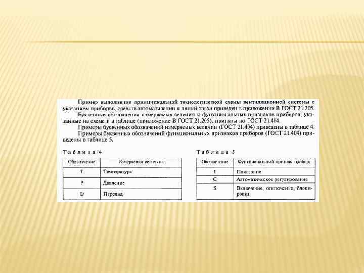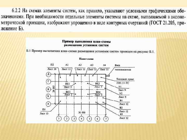 ГОСТ-21. 205 ПРИМЕРЫ ПОСТРОЕНИЯ ОБОЗНАЧЕНИЙ ЭЛЕМЕНТОВ СИСТЕМ Наименование Обозначение 1 Воздухоохладитель с форсуночным распылением 2 Подвод теплоносителя к подогревателю воздуха* Примечание - Трубопровод подогревающей или охлаждающей среды изображают линиями, подведенными к сторонам квадрата 3 Заслонка приводом вентиляционная с электромагнитным 4 Вентилятор радиальный с электромашинным приводом 5 Клапан регулирующий с электромашинным приводом