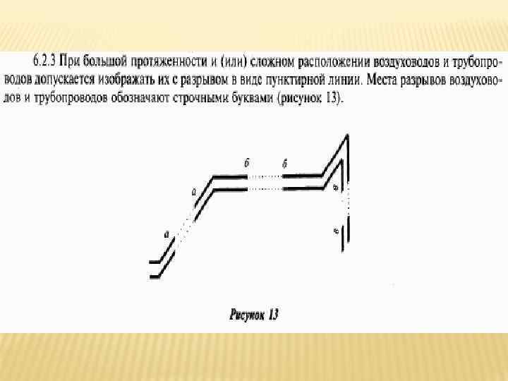 Графические обозначения элементов систем вентиляции и кондиционирования приведены в таблице Наименование Условное обозначение на видах сверху и на планах 5 Агрегат отопительный** воздушно- 7 Воздуховод (под упрощенном графическом изображении двумя линиями): а) круглого сечения*** б) прямоугольного сечения 8 Отверстие (решетка) для забора воздуха** на видах спереди или сбоку, на разрезах и схемах