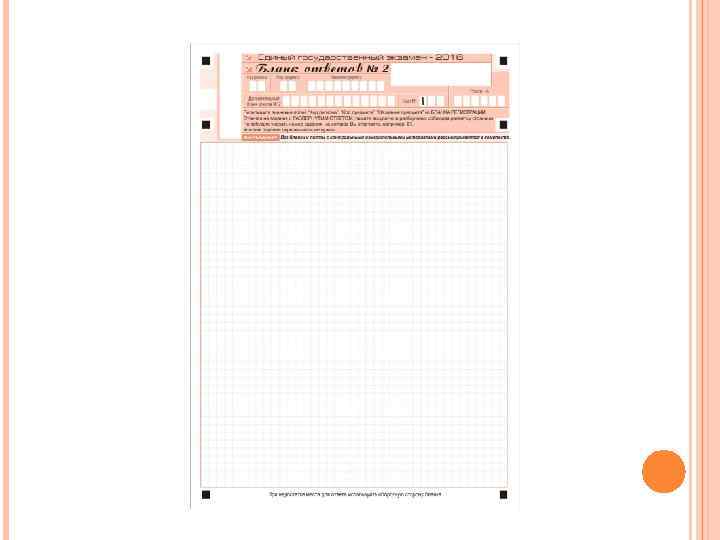 БЛАНК ОТВЕТОВ № 2 Бланк ответов № 2 предназначен для записи ответов на задания с развернутым ответом (строго в соответствии с требованиями инструкции к КИМ и к отдельным заданиям КИМ). Информация для заполнения полей верхней части бланка ответов № 2 ( «Код региона» , «Код предмета» и «Название предмета» ) должна соответствовать информации, внесенной в бланк регистрации и бланк ответов № 1. Поле «Дополнительный бланк ответов № 2» заполняет организатор в аудитории при выдаче дополнительного бланка ответов № 2, вписывая в это поле цифровое значение штрихкода дополнительного бланка ответов № 2 (расположенное под шрихкодом бланка), который выдается участнику ЕГЭ. Поле «Резерв-6» не заполняется. При недостатке места для ответов на лицевой стороне бланка ответов № 2 участник ЕГЭ должен продолжить записи на оборотной стороне бланка, сделав в нижней части области ответов лицевой стороны бланка запись «смотри на обороте» . Для удобства все страницы бланка ответов № 2 пронумерованы и разлинованы пунктирными линиями «в клеточку» . При недостатке места для ответов на основном бланке ответов № 2 участник ЕГЭ должен продолжить записи на дополнительном бланке ответов № 2, выдаваемом организатором в аудитории по требованию участника ЕГЭ в случае, когда в области ответов основного бланка ответов № 2 не осталось места. В случае заполнения дополнительного бланка ответов № 2 при незаполненном основном бланке ответов № 2, ответы, внесенные в дополнительный бланк ответов № 2, оцениваться не будут.