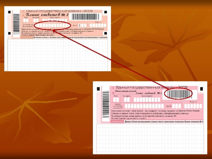 n n Дополнительный бланк ответов № 2 выдается организатором в аудитории по требованию участника ЕГЭ в случае нехватки места для развернутых ответов. В верхней части дополнительного бланка ответов № 2 расположены вертикальный и горизонтальный штрихкоды, поле «Резерв 9» (не заполняемое участником ЕГЭ), а также поля «Следующий дополнительный бланк ответов № 2» и «Лист №» . Информация для заполнения полей верхней части бланка должна полностью совпадать с информацией основного бланка ответов № 2, кроме полей «Следующий дополнительный бланк ответов № 2» и «Лист №» , которые заполняет организатор в аудитории. Поле «Лист №» заполняется при выдаче дополнительного бланка ответов № 2, а поле «Следующий дополнительный бланк ответов № 2» заполняется при выдаче следующего дополнительного бланка ответов № 2 при нехватке места на ранее выданных бланках ответов № 2.