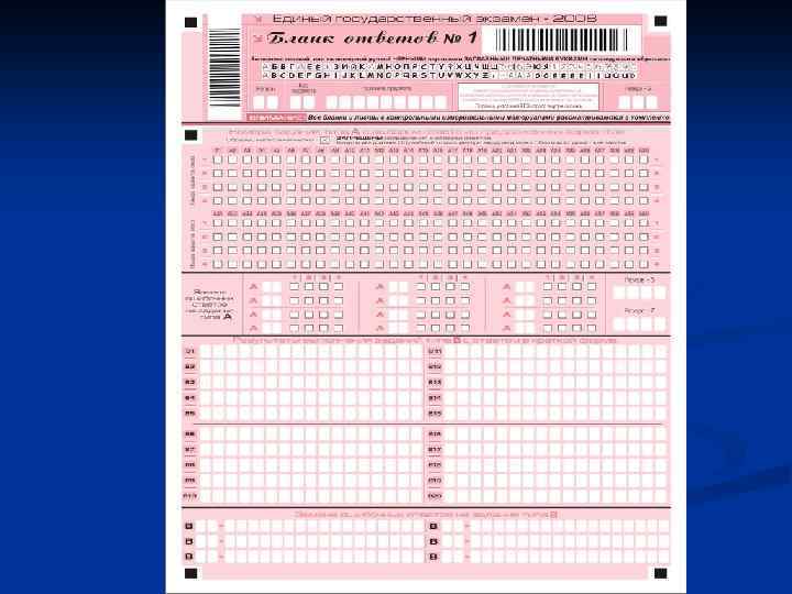 В верхней части бланка расположены: n n n вертикальный и горизонтальный штрихкоды; строка с образцами написания символов; поля для рукописного занесения информации; поле для подписи участника ЕГЭ; поле для служебной отметки и резервное поле.