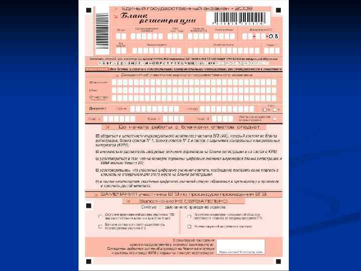 n Заполнение полей замечаний необязательно и производится по желанию участника ЕГЭ. В этой области участник ЕГЭ может отметить замечания по процедуре ЕГЭ в день его проведения. n Заполнение полей в области замечаний участников ЕГЭ не является поводом для возбуждения процедуры рассмотрения апелляций. n После окончания заполнения бланка регистрации и выполнения всех пунктов памятки по работе с бланками ЕГЭ (До начала работы с бланками ответов) участник ставит свою подпись в специально отведенном для этого поле.