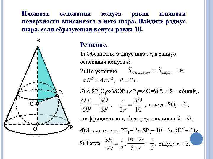 Площадь основания конуса равна площади поверхности вписанного в него шара. Найдите радиус шара, если образующая конуса равна 10. S Решение. 1) Обозначим радиус шара r, а радиус основания конуса R. т. е. 2) По условию 3) SP 1 O 1 SOP ( Р 1= О=90 , S – общий), Р 1 О 1 откуда SO 1 = 5 , коэффициент подобия треугольников k = ½. O Р 4) Заметим, что РР 1= 2 r, SP 1= 10 – 2 r, SO = 5+r. 5) Тогда откуда r = 3.
