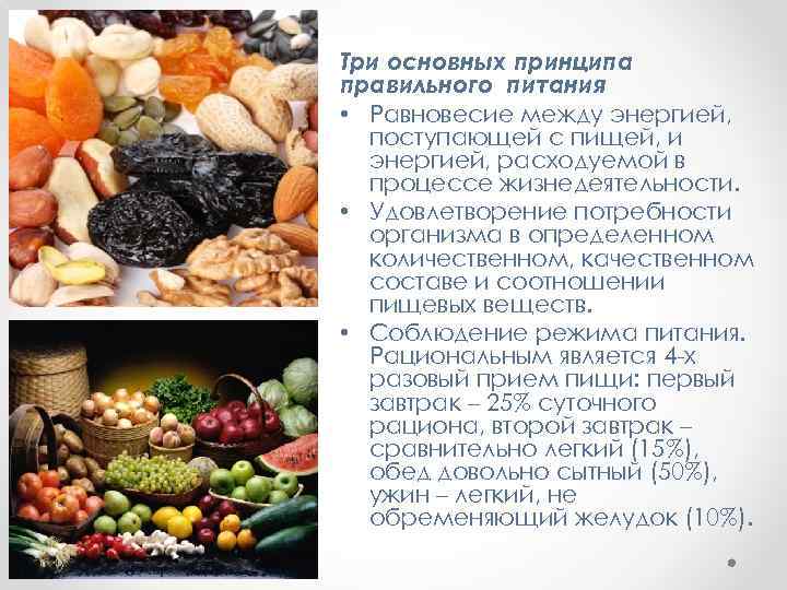 Три основных принципа правильного питания • Равновесие между энергией, поступающей с пищей, и энергией, расходуемой в процессе жизнедеятельности. • Удовлетворение потребности организма в определенном количественном, качественном составе и соотношении пищевых веществ. • Соблюдение режима питания. Рациональным является 4 -х разовый прием пищи: первый завтрак – 25% суточного рациона, второй завтрак – сравнительно легкий (15%), обед довольно сытный (50%), ужин – легкий, не обременяющий желудок (10%).