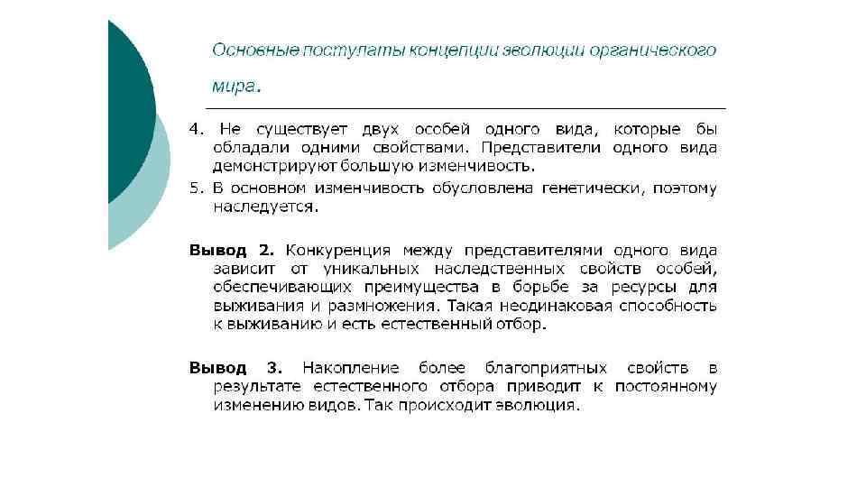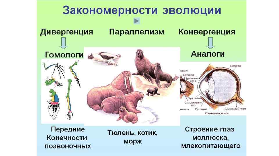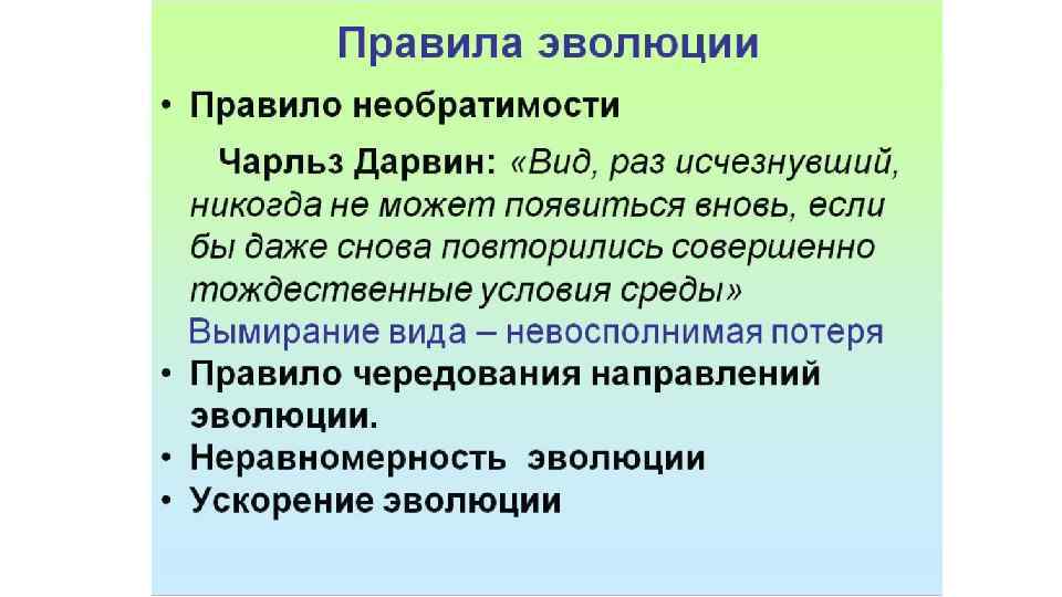 Правило необратимости эволюции (правило Л. Долло): эволюционный процесс необратим, возврат к прежнему эволюционному состоянии, ранее осуществленному в ряду поколений предков, невозможен. Правило происхождения от неспециализированных предков (правило Э. Копа): возникновение новых крупных групп, сопровождающихся повышением уровня организации, связано с примитивными неспециализированными формами. Правило прогрессирующей специализации (правило Ш. Депере): организмы единожды ставшие на путь узкой специализации, в дальнейшем буду развиваться по пути все более глубокой специализации.